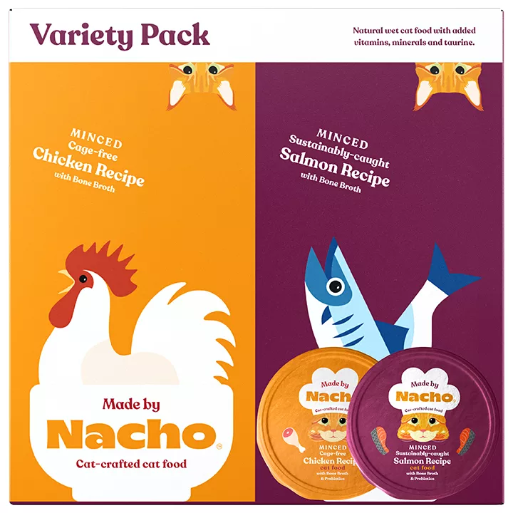 One of the most important responsibilities of being a pet parent is deciding what type of food to feed your cute kitty. If you’re searching for a healthy cat food that nourishes your feline friend and gives them extra vitamins and minerals, Made by Nacho™ cat food is a great choice for you and your cat. PetSmart is proud to offer Made by Nacho cat food in many different flavors and varieties. Made by Nacho™ makes natural food and treats that are made with cage-free chicken, sustainably-caught salmon and grass-fed beef so your furry best friend gets only the finest ingredients.